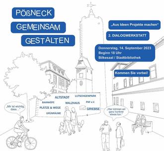 Die 2. öffentliche Dialogwerkstatt findet am Donnerstag, dem 14. September 2023 ab 18 Uhr wieder vor Ort im Bilkesaal statt (Stadtbibliothek Pößneck, Klosterplatz 1). Darin möchten wir Ihnen zunächst die Ergebnisse der vorangegangenen Beteiligungsrunden vorstellen sowie einen Blick auf ersten mögliche Maßnahmen werfen. Was für Ideen und Vorschläge zur Entwicklung von Pößneck sind von Ihnen bei uns eingegangen? Welche Themen und Orte haben Potenzial bzw. sollten mehr in den Fokus rücken?