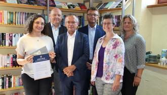 Martina Rübesam (links), Leiterin der Bilke, nahm den Preis von Vertretern der Sparkassen-Kulturstiftung Hessen-Thüringen, der Kreissparkasse Saale-Orla sowie des Thüringer Bibliothekswesens entgegen. Das Preisgeld soll Jugendlichen zugutekommen, speziell der örtlichen Manga-AG, die rund 50 Mitglieder von Pößnecker Regelschule und Gymnasium zählt. Die jungen Fans der japanischen Comics können nun selbständig entscheiden, wofür sie das Geld im Rahmen der AG verwenden. Großes Ziel dahinter ist es, noch mehr junge Menschen für das Angebot der Bilke zu begeistern.