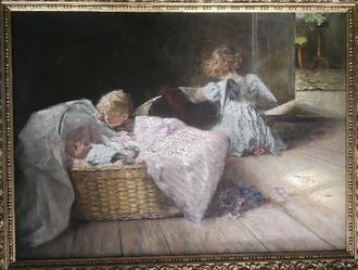 Das opulente Bildwerk von 136 x 176 cm Größe samt Goldstuckrahmen schließt gleich mehrere Lücken der Pößnecker Sammlung, in der sich vorwiegend Porträts, Landschaften und Stillleben finden, welche das Gesamtwerk Clara Walthers bestimmen. Eine kleine Auswahl derer ist bereits in der Schausammlung der Dauerausstellung des Pößnecker Stadtmuseums zu besichtigen. Hier wird auch der Neuzugang seinen Platz finden. Zum Bildwerk gehört ein Originalbrief aus dem Jahr 1912 an und von der Künstlerin, welcher Hinweise zur weiteren Herkunftsgeschichte gibt und in die neue Präsentation des Gemäldes integriert werden soll. Die Exponate der Schausammlung werden aus diesem Anlass im Vorfeld teilweise neu arrangiert. Wobei das Gemälde nicht nur durch seine außergewöhnliche Größe besticht, sondern auch durch sein religiös anmutendes Thema: ein schlafendes Baby liegt mit halb aufgedeckter Bettdecke in einem Zimmer in seinem geflochtenen Körbchen, während es ein kleiner Engel über es gebeugt im Schlaf beobachtet und ein anderer links dahinter in einer Truhe stöbert.