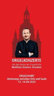 Vom 12. bis 14. September 2025 gastiert Matthias Grünert, Kantor der weltberühmten Dresdner Frauenkirche, mit seiner Orgelfahrt Zwischen Orla und Saale in unserer Region - ein Fest für Liebhaber klassischer Musik und Freunde der Orgelkunst gleichermaßen. In nur drei Tagen wird Grünert 12 Orgeln zum Klingen bringen - von der majestätischen romantischen Orgel der Stadtkirche Pößneck, Thüringens größtem Instrument dieser Art, bis hin zu den liebevoll gepflegten Kleinoden in den Dorfkirchen von Schlettwein, Liebengrün oder Schönborn. Jeder dieser Orte wird zur Bühne für ein außergewöhnliches Konzerterlebnis. „Es ist mir ein Herzensanliegen, die Vielfalt und den Charakter der Orgeln im ländlichen Raum hörbar zu machen“, sagt Matthias Grünert.