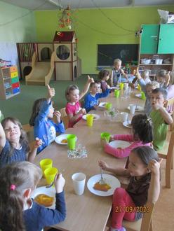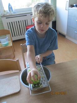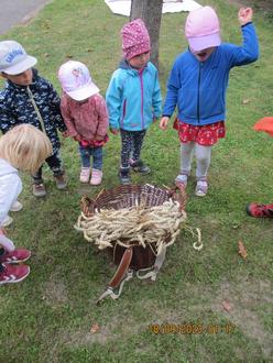Im September zog bei uns im Kindergarten der Herbst ein und wir feierten Erntedank. Wir sammelten Gaben und thematisierten mit den Kindern, warum wir das Erntedankfest feiern. Die Wackelzähne übergaben die Spenden der Kirche und gestalteten den Gabentisch. Ebenso entstanden aus den mitgebrachten Lebensmitteln bei uns im Kindergarten leckere Gerichte. Die Kinder kochten Suppen, Auflauf und haben Zuccinikuchen gebacken. Das Selbstgekochte hat allen sehr gut geschmeckt und wir bedanken uns bei allen Eltern für das Mitbringen der Gaben.