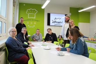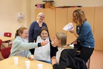 Wo sonst Deutsch und Mathe, Englisch oder Sozialkunde gelernt wird, wurde über Berufe und Ausbildungsinhalte gesprochen. Die Elotech, die Kombus und das Feingusswerk erklärten was geleistet wird. Die Polizei, Bundeswehr und Sparkasse hatten guten Zulauf. Das DRK kam mit ganzer Notfallausrüstung, um die Aufgaben zur Lebensrettung genau beschreiben und vorführen zu können. Marika Gliemann und Ramona Kleinhenz von der Diakoniestiftung ließen Blutdruck messen und Apfelmus löffeln. „Beim gegenseitigen Essen reichen, bekommt man ein Gefühl für die Aufgaben in der Pflege und man kommt ins Gespräch", sagt die Praxisanleiterin im Haus Elisabeth. Dann seien aber die 45 Minuten zu kurz, um sich intensiver austauschen zu können. Deshalb wird ein zweiter Besuch, dann auch gern im Seniorenzentrum angeregt.