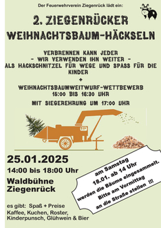 Im neuen Jahr 2025 startet der Feuerwehrverein Ziegenrück e.V. die erste Veranstaltung in dem kleinen Saalestädtchen. Das 2. Ziegenrücker Weihnachtsbaum - Häckseln.