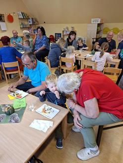 Die Kinder der Regenbogengruppe und ihre Großeltern trafen sich in Ranis und sind zum Artenschutzzentrum gelaufen. In der Ausstellung gab es Interessantes zu entdecken und im Anschluss ließ man sich selbstgebackenen Apfelkuchen schmecken.