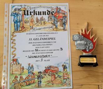 Die Jugendfeuerwehr Wilhelmsdorf hat sich Samstag, 6:00 Uhr im Feuerwehrgerätehaus eingefunden. Alle 14 gemeldeten Kinder und Jugendliche waren pünktlich da. Zusammen mit den 3 Betreuern ging's nach Gera zum Geländespiel. Kurze Anmeldung und 8.40 Uhr startete die Mannschaft auf den 10 km langen Rundkurs. Dorf galt es 10 verschiedene Stationen gemeinsam im Team zu absolvieren. Die Aufgaben dabei waren ganz verschieden. Es mussten Nägel eingeschlagen, Wissenstests, Knoten, erste Hilfe, Aufbau einer Saugleitung, sauberes Verlegen von Schläuchen, Ertasten von Feuerwehrtechnik oder auch einfach gemeinsam Ski gelaufen werden. Zwischendurch gab's reichlich Verpflegungsstationen und zum Abschluss nochmal ordentlich Nudeln. In dieser Zeit wurden die Ergebnisse der einzelnen Mannschaften ausgewertet. Bis die Siegerehrung anstand, konnten noch allerhand Feuerwehrtechnik und Fahrzeuge bestaunt werden, aber auch Reaktionstests und Laserschießübungen bei der Polizei wurden reichlich genutzt. Am Ende erreichte Wilhelmsdorf mit 82 Punkten in der Gruppe B den 3. Platz.