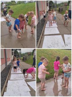 Heute hat es mal wieder geregnet und es gab eine große Pfütze hinter unserem Kindergarten. Schuhe aus und wir Kinder der Teddygruppe hüpften durch die Pfütze, was für ein Spaß.