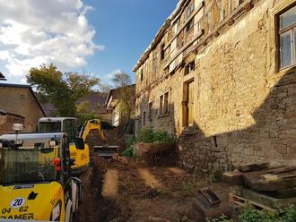 Schweres Gerät rückte dieser Tage auf der Baustelle am Raspehaus an: die Eingangstreppe des bedeutenden Thüringer Kulturdenkmals wird instandgesetzt. Dazu werden zunächst die Überreste der vorhandenen Zuwegung in das Gebäude abgetragen, bevor ein Treppenneubau aus Beton entstehen wird. Aufgrund der anhaltenden Baustellensituation sowie der zukünftigen Arbeiten im und am Raspehaus wird diese Betontreppe zunächst als Übergangslösung genutzt. „Nach Abschluss der groben Arbeiten ist es vorgesehen, den Betonblock mit originalen Steinen und Materialien zu besetzen, sodass die Eingangstreppe schlussendlich wieder dem ursprünglichen Zustand nahekommt. Da sie einen zentralen Punkt des Denkmalwerts ausmacht, wollen wir so verhindern, dass die originalen Steine während der laufenden Arbeiten nachhaltig beschädigt werden“, erklärt Andreas Martini als Vorsitzender des Fördervereins Raspehaus.