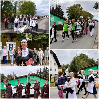 Ganz besonders freuen wir uns über die Teilnahme der TT-Jugend am Festumzug. Auch wenn es sicher nicht als Höhepunkt des Sommers in die Erinnerung der Jungs einfließen wird, haben sie als Mönche das Wasser der Heilquelle über die Alpen zum Pabst gebracht. Danke, Jungs! Einige Tanz-Kinder haben die Schilder getragen und unseren Handwagen gezogen. Schön.