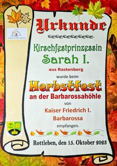Am 15.10. folgte ich einer Einladung der etwas anderen Art. Mein Weg führte mich nach Rottleben zur sagenumwobenen Barbarossahöhle. Auf dem Höhlengelände fand das Herbstfest statt, zu welchem kein geringer als Kaiser Barbarossa eingeladen hatte. Er ist aus seinem Höhlenreich gekommen, um mit uns gemeinsam zu feiern. Das Fest begann mit einem fröhlich bunten Programm. Auch wir Gasthoheiten durften uns beteiligen. Das Programm führte durch das Jahr, jede Hoheit wurde in die passende Jahreszeit eingebunden. Natürlich war ich im Sommer an der Reihe und durfte mich vorstellen. Im Anschluss fand, wie auch in den anderen Jahreszeiten, ein höfischer Tanz statt.