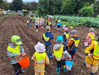 Der Wind wehte uns in den letzten Wochen von Ort zu Ort und ähnlich wie die bunten Herbstblätter tanzten unsere Kinder von Abenteuer zu Abenteuer. Mit Gummistiefeln und Regensachen machte ihnen das Wetter gar nichts aus und so zogen viele kleine Hände über das Feld von Familie Müller aus Bachra. Wir lasen alle zusammen die Kartoffeln auf und kürten die größte Kartoffel als Kartoffelkönig. Denn wenn die Kartoffel nicht wäre, haben die Kinder festgestellt, gäbe es viele köstliche Leckerein nicht, die sie doch so gern essen.
