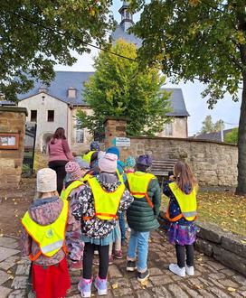 Bald darauf fanden wir einen weiteren Grund zu feiern: unsere Kinderkirmes. Reich konnten wir an diesem Tag von den mitgebrachten Erntedankkörbchen schlemmen. Aber wer so viele Köstlichkeiten hat, sollte unserer Meinung nach auch teilen. Deswegen liefen wir mit unseren Körbchen in die Kirche von Bachra zu Frau Weber. Jedes Kind legte sein mitgebrachtes Obst und Gemüse ab und so deckten alle zusammen den vollen Erntetisch. Alle Gaben wurden später nach Erfurt an die Stadtmission gespendet. Zum Abschluss hörten wir von Frau Weber eine schöne Geschichte über die Erntezeit, tanzten zu einem tollen Kartoffelsong und zurück im Kindergarten feierten wir ausgelassen.