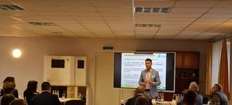 Der VG Vorsitzende Sebastian Goldhorn stellte, als Einführung in die Hauptthemen der Veranstaltung, die Smart Region Strategie der VG Kölleda vor. Ziel der Strategie ist es, innovative Ansätze für die alltäglichen Probleme von ländlichen Kommunen zu finden und dabei „über den Tellerrand“ zu schauen. Als Beispiele für die konkreten Projekte innerhalb der Strategie nannte er die Etablierung von 24-h-Dorfläden, die Eröffnung von Gesundheitskiosken und eben die konsequente Nutzung der erneuerbaren Energien. Wie sein Vorredner stellte er dabei heraus, dass es dabei insbesondere um die finanzielle Teilhabe der Bürger in den Standortgemeinden geht. Er unterstrich dabei, wie wichtig der VG Kölleda die Gründung einer lokalen Energiegenossenschaft ist, in der sich jeder Bürger aus der Region gegen einen geringen Betrag beteiligen kann und dafür eine attraktive Verzinsung erhalten soll. Investieren soll die Genossenschaft in die Ausstattung der kommunalen Gebäude mit Photovoltaik, Freiflächen-PV-Anlagen und perspektivisch auch in den zweitgrößten Windpark Thüringens an dessen Fuß die VG liegt. Seinen Vortrag rundete Goldhorn mit dem Bild einer Rosine ab. Damit sollte deutlich werden, was die VG nicht will: Investoren, die sich das rentabelste Projekt vor Ort heraussuchen und dann ohne nachhaltiges Engagement vor Ort wieder das Weite suchen.
