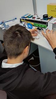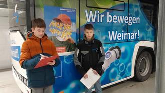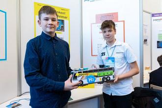 Unter dem Titel "Sonne tanken - H2 Bus in Weimar" präsentierten Lenny Schirrmeister (14) und Matti Meinhard (14) ihr Projekt beim diesjährigen Jugend forscht Wettbewerb.