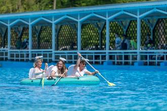 Das erste Rennen im 14 Grad warmen Wasser absolvierten vier Boote in der Schlauchbootkategorie. Am Start waren das Team „Das verrückte Federvieh“, „Die fliegenden teuflischen Engel“, „Feuerwehr II“ und ein Einzelkämpfer namens „Die arme Sau“. Anhand der Team-Namen waren die einzelnen Boote jederzeit gut vom Publikum zu erkennen. Alle Teams hatten sich entsprechend kostümiert und konnten gut zugeordnet werden. Insbesondere „Die arme Sau“ war nicht zu übersehen. Nach einem spannenden Rennen konnte sich die arme Sau den Sieg sichern und verwies die Teams Feuerwehr II und die teuflischen Engel auf die Plätze.