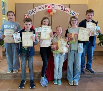 Am Ende durften sich alle Teilnehmer über Buch- und kleine Sachpreise freuen - ganz besonders Jette Barth (Kl. 3) und Merle Eckert (Kl. 4), die in ihrer jeweiligen Klassenstufe den ersten Platz belegten. Herzlichen Glückwunsch! Beide Mädchen werden unsere Schule stolz beim Vorlesewettbewerb des Landkreises am 22. Mai in Sömmerda vertreten.