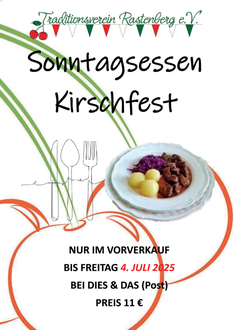 die Bürgermeisterin und der Traditionsverein Rastenberg e.V. laden Sie herzlich zum Kirschfestnachmittag mit Kaffee und Kuchen am Freitag, den 11. Juli 2025, ab 14.30 Uhr ein.