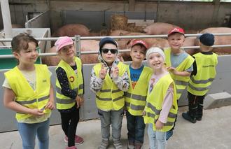 In Roldisleben angekommen, besuchten wir die Familie Weilepp, die uns schon freudig erwartete. Dort sahen wir uns die vielen Schweine und Kühe an. Hier erfuhren wir viel Wissenswertes über die Schweineaufzucht. Wir durften auch die Kühe füttern und streicheln. Auf dem Bauernhof gab es auch noch Pferde und Esel zu bestaunen. Danach ging es in die große Halle, wo es Traktoren, eine Scheibenegge und Mähdrescher zu bestaunen gab.
