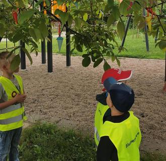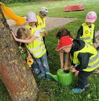 Gestärkt und frohen Mutes ging es zum Spielplatz. Dort wartete eine große Überraschung: ein Zuckertütenbaum. Die Zuckertüten sind noch klein, deshalb haben wir sie fleißig gegossen, in der Hoffnung, dass sie noch wachsen!