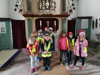 Ein Höhepunkt jagte den nächsten: vom Spielplatz sind wir dann zur Bienenkirche gewandert, wo Frau Bismark schon auf uns wartete. Hier haben wir Wissenswertes über die Bienen erfahren und durften uns auch die Kirche von innen betrachten.