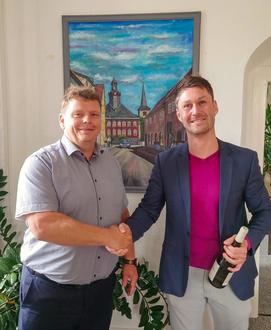 Sebastian Goldhorn, Gemeinschaftsvorsitzender der VG Kölleda, ließ es sich nicht nehmen den neuen hauptamtlichen Kölledaer Bürgermeister Uwe Kraneis im Amt zu begrüßen. Als kleinen Willkommensgruß gab es eine Flasche Wein vom Weimarer Poetenberg.