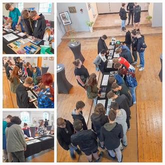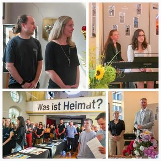 Am Nachmittag folgte dann die offizielle Eröffnung des Kunstherbstes mit der Vernissage der Ausstellung "Was ist Heimat?" des Prof. Hofmann Gymnasiums Kölleda. Die Schüler und Schülerinnen haben mit ihren Kunsterziehern Frau Störmer und Herrn Röthe eine wirklich sehenswerte Performance auf die Beine gestellt - allein den Aufbau der Ausstellung zu verfolgen, war ein schönes Erlebnis: mit so viel Energie und Engagement sind an die 30 Schüler mit ihren Lehrern an diese Aufgabe herangegangen, dass dem perfekten Ergebnis nichts im Wege stand. Die Vernissage wurde musikalisch begleitet von Schülern des Gymnasiums - ein perfekter Rahmen!