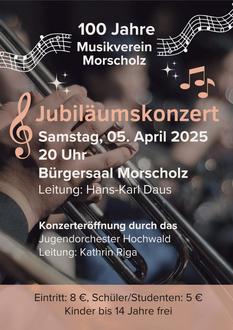 In diesem Jahr feiert der Musikverein Morscholz sein 100-jähriges Jubiläum und lädt am 5. April 2025 um 20 Uhr zu einem festlichen Konzert in den Bürgersaal nach Morscholz ein.