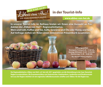 An vielen Stellen im Saarschleifenland können Sie sich schöne Ebbes-von-Hei-Geschenkboxen und -körbe zu Ostern zusammenstellen lassen. So bietet nicht nur unsere Tourist-Information im Waderner Rathaus, sondern auch die touristischen Anlaufstellen der Gemeinden Losheim und Perl und die Tourist-Info am Cloef-Atrium, der Naturbursche in Losheim und Genußvoll in Merzig Boxen zu verschiedenen Themen und Preisklassen an, das passende Weihnachtsgeschenk für Ihre Lieben.