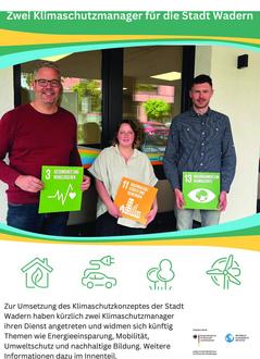 Zur Umsetzung des Klimaschutzkonzeptes der Stadt Wadern haben kürzlich zwei Klimaschutzmanager ihren Dienst angetreten und widmen sich künftig Themen wie Energieeinsparung, Mobilität, Umweltschutz und nachhaltige Bildung. Weitere Informationen dazu im Innenteil.