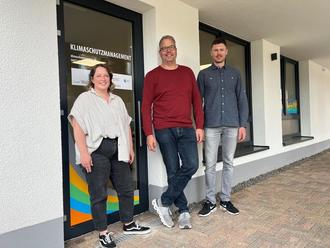 Die Klimaschutzmanager Maria Herrmann und Manuel Schnur zusammen mit Bürgermeister Jochen Kuttler vor dem Büro am Marktplatz 15.