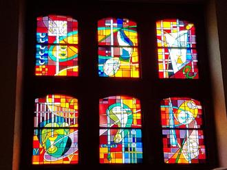 BU (kursiv): Farbenprächtige Fenstergestaltung von Marianne Aatz für die Kirche St. Marien in Alschbach bei Blieskastel (Foto: Stadt Wadern)