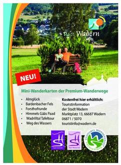 Gefaltet zum praktischen A6-Format, bieten unsere Mini-Wanderkarten eine Übersichtskarte des jeweiligen Premiumwanderweges sowie eine Wegbeschreibung und Hinweise zu Sehenswürdigkeiten und Einkehrmöglichkeiten. Die Karten sind kostenlos an der Touristinfo im Rathaus erhältlich.