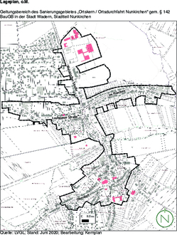 Im nachfolgend unter § 2 dieser Satzung näher beschriebenen Gebiet liegen städtebauliche Missstände gemäß § 136 Abs. 2 BauGB vor. Dieser Bereich soll durch städtebauliche Sanierungsmaßnahmen wesentlich verbessert oder umgestaltet werden. Das insgesamt ca. 42,7 ha umfassende Gebiet wird hiermit förmlich als Sanierungsgebiet festgelegt und erhält die Bezeichnung „Ortskern / Ortsdurchfahrt Nunkirchen“.