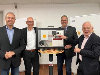 Der stellvertretende Ministerpräsident des Saarlandes und Wirtschaftsminister, Jürgen Barke, schaltet im Beisein von Bürgermeister Jochen Kuttler, energis-Vertriebsleiter Jochen Strobel und Ortsvorsteher Michael Dewald die Steinberger Feuerwehr als ersten Kunden an das Glasfasernetz an.