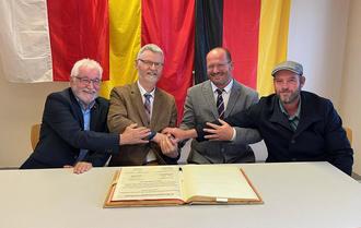 Im Goldenen Buch der Stadt dokumentierten Jürgen Kreuder (Erster Beigeordneter Stadt Wadern), Sobotkas Bürgermeister Lubomir Jencek (Mitte von li) mit ihren Unterschriften die Fortsetzung der Partnerschaft zwischen Wadern und Sobotka. Ebenfalls haben Erich Brücker (li), Partnerschaftskomitee, sowie der Wadrilltaler Ortsvorsteher Alexander Marmitt (re) unterschrieben.