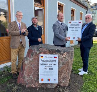 : Zudem haben die Verantwortlichen einen Partnerschaftsstein enthüllt, an dem eine Erinnerungstafel zur Städtepartnerschaft angebracht ist.