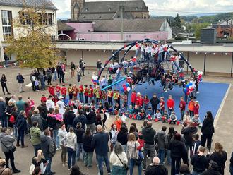 Bürgermeister Jochen Kuttler und Schulleiterin Birgit Schmidt bedankten sich in ihren Grußworten bei allen, die zur Neugestaltung beigetragen haben. Nach einem abwechslungsreichen Musikprogramm, das von verschiedenen Klassen mitgestaltet wurde, hatten die Kinder endlich die Gelegenheit, die Kletterspinne zu erobern.