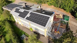 Zwei PV-Anlagen wurden nun auf der Dachfläche der Kindertagesstätte Löstertal installiert. Eine Anlage ist zur Deckung des Eigenverbrauchs der Kita ausgelegt und soll lediglich den überschüssigen Strom ins Netz liefern. Die andere hingegen ist rein für die Netzeinspeisung vorgesehen.