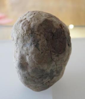 Terrakotta-Rassel in Form eines menschlichen Kopfes, gefunden im Umfeld der Monumentalgrabhügel von Oberlöstern