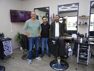 Radwan Ghazi rechts und Mitarbeiter Iyad Qasem mit Bürgermeister Jochen Kuttler im neuen Friseursalon.