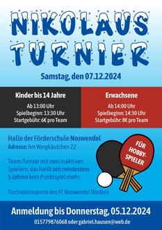 Das Nikolausturnier ist zurück! Nach dem erfolgreichen Turnier imletzten Jahr veranstaltet die Tischtennissparte des FC Noswendel Wadern wieder für Hobbyspieler und Inaktive ein Dorfturnier. Aufgrund der positiven Resonanz insbesondere von Kindern und Jugendlichen veranstalten wir in diesem Jahr zwei Turniere.
