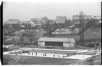Schlittschuhlaufen im gefrorenen Freibad Wadern 1961, Nr. 2021MSF24409, Theo Plettenberg Archiv im Kreisheimatarchiv im Museum Schloss Fellenberg