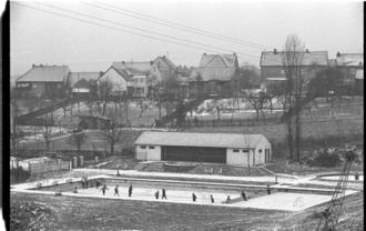 Schlittschuhlaufen im gefrorenen Freibad Wadern 1961, Nr. 2021MSF24409, Theo Plettenberg Archiv im Kreisheimatarchiv im Museum Schloss Fellenberg