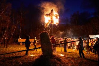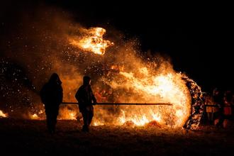 Alles ist dunkel auf dem Perscher Berg, dem Hausberg des Hochwald-Dorfes Wadrill [...]. Nur die Sterne am Himmel und die kleinen Lichter unten im Tal leuchten. Es ist eine gewisse Anspannung spürbar, alle warten auf das große Spektakel. Und dann geht es los: Laut und kräftig erklingt das Lied „Großer Gott wir loben dich“. Zwei Kerzen werden entzündet und von beiden Seiten an ein Strohkreuz gehalten bis es Feuer fängt. Dann wird das Kreuz langsam auf ein großes Strohrad herabgesenkt und plötzlich steht auch dieses in Flammen. Ein Gänsehaut-Moment. Die Musik und die brennenden Symbole erzeugen eine mystische, bedeutungsschwere Atmosphäre. Vier kräftige Männer halten das Rad an den Naben, den seitlichen Eisenstangen, und setzen es vorsichtig in Bewegung. Unter ihrer Führung rollt es nun Richtung Tal, Flammen schlagend und Funken sprühend. Unten angekommen, senkt es sich zischend und rauchend in das Wasser der Wadrill.