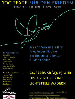 Genau ein Jahr nach Kriegsbeginn, am 24. Februar 2023, um 19.00 Uhr, veranstalten wir im Historischen Kino Lichtspiele Wadern eine musikalische Lesung mit Texten von Clara Brill (Poetry Slammerin des Jahres), Diana P. Lavender, Boris Greff, David Hauck, Thomas Kuhn, Matthias Schäfer, Andreas Vogel. Musikalisch begleitet wird die Lesung von „Troubadour“ (Andreas Tomasini und Günter Zewe) mit Stücken von Hannes Wader, Reinhard Mey, John Lennon, Arlo Guthrie, Bob Dylan u.a.