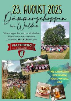 So findet am 23.08.2025 der Dämmerschoppen unter dem Ahornbaum in Waldau statt. Ein stimmungsvoller und musikalischer Abend, begleitet durch die Wachbergmusikanten, lädt zum Verweilen ein.