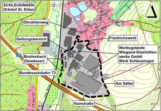 Das Plangebiet liegt nordöstlich der Kernstadt Schleusingen und südlich des Ortsteiles St. Kilian. Es ist Bestandteil des Werksgeländes der Wiegand-Glashüttenwerke GmbH, Werk Schleusingen. Entlang des Geltungsbereiches der 3. Änderung verläuft östlich die Straße „Am Sättel“. Die „Hainstraße“ begrenzt den Bereich der 3. Änderung im Süden. Im Norden endet die Straße „Friedrichswerk“ direkt am Plangebiet. Begrenzt wird der Geltungsbereich im Norden von der Straße „Ölmühlenweg“. Westlich wird die 3. Änderung im Wesentlichen durch den Breitenbach (Gewässer) begrenzt.