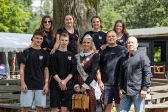 Mitglieder der Kirmesgesellschaft Hinternah und Vereinsvorsitzender Tino Blaurock gemeinsam mit der Purzelmarktkönigin 2023/2024 Jeany I. (Foto: Steffen Ittig)