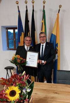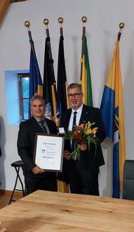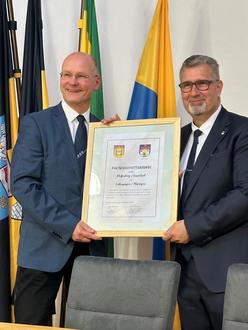 Wie vom Stadtrat am 23. Mai 2024 beschlossen, wurde zwei prägenden Persönlichkeiten der Stadtgeschichte diese höchste Auszeichnung Schleusingens verliehen: Thomas Franz, langjähriger Bürgermeister von Nahetal-Waldau, und Klaus Brodführer, ehemaliger Bürgermeister von Schleusingen.