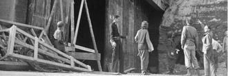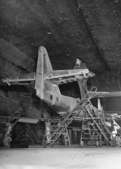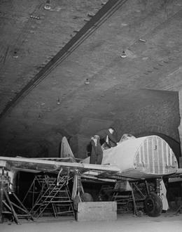 Alliierte Berichterstatter im Bunker 0 beim Inspizieren einer halbfertigen Me 262. Beide Männer sind auch auf dem obigen Foto, vor Bunker 0 erkennbar.