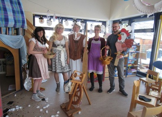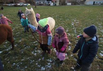 Anlässlich dieses Jubiläums feierten wir im Januar eine ganze Woche mit vielen Überraschungen. Am Montag hieß es „Wie es früher einmal war“. Die Waschfrauen besuchten uns und wir hatten viel Spaß beim Waschen unserer Puppenwäsche in der Wanne mit dem Waschbrett. Ein Zimmermann zeigte uns wie früher das Holz bearbeitet wurde und wir konnten uns selbst ausprobieren. Im Außengelände gab es etwas ganz Besonderes zu bestaunen. Als Geburtstagsüberraschung für unseren Conrad waren 2 Alpakas angereist, alle Kinder hatten viel Freude mit diesen friedlichen Tieren.